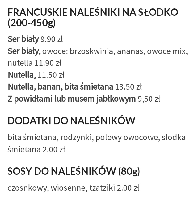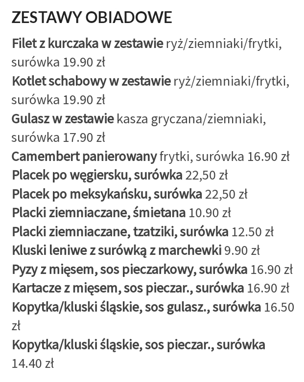 Tradycyjna polska kuchnia zachwyca szerokim wyborem dań. Nasze zdrowe dania mają coś dla każdego. Mamy wyjątkowo pyszne dania z makaronu i pierogi. Wielu gości przychodzi do nas, aby posmakować naszych pysznych naleśników. Przyjdź do nas na brunch, na obiad lub na kolację!